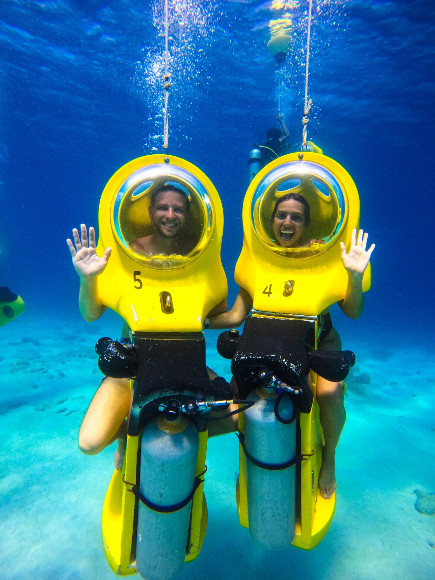 Our eco-friendly underwater scooter features a bell-shaped glass container that is supplied with oxygen from a scuba-dive tank. Water will not enter this glass dome and you do not need to wear a mask or mouthpiece.